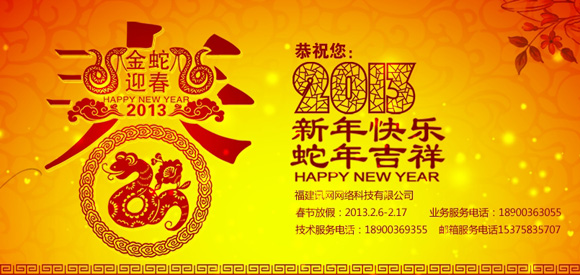 歲月如梭,一年一度的春節(jié)長假又將來臨,值此新春佳節(jié)之際,福建訊網(wǎng)全體員工衷心感謝您在過去一年里對訊網(wǎng)的支持和信任,提前給各位新老朋友拜年,恭祝大家生意興隆、事業(yè)大吉、闔家歡樂,蛇年吉祥!