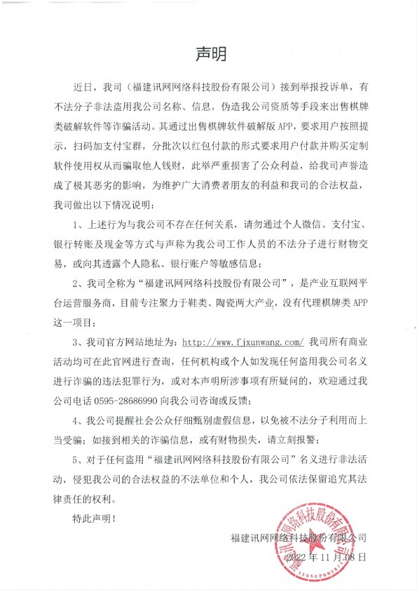 近日,我司(福建訊網(wǎng)網(wǎng)絡科技股份有限公司)接到舉報投訴單,有不法分子非法盜用我公司名稱、信息,偽造我公司資質等手段來出售棋牌類破解軟件等詐騙活動。其通過出售棋牌軟件破解版APP,要求用戶按照提示,掃碼加支付寶群,分批次以紅包付款的形式要求用戶付款并購買定制軟件使用權從而騙取他人錢財,此舉嚴重損害了公眾利益,給我司聲譽造成了極其惡劣的影響,為維護廣大消費者朋友的利益和我司的合法權益,我司做出以下情況說明: