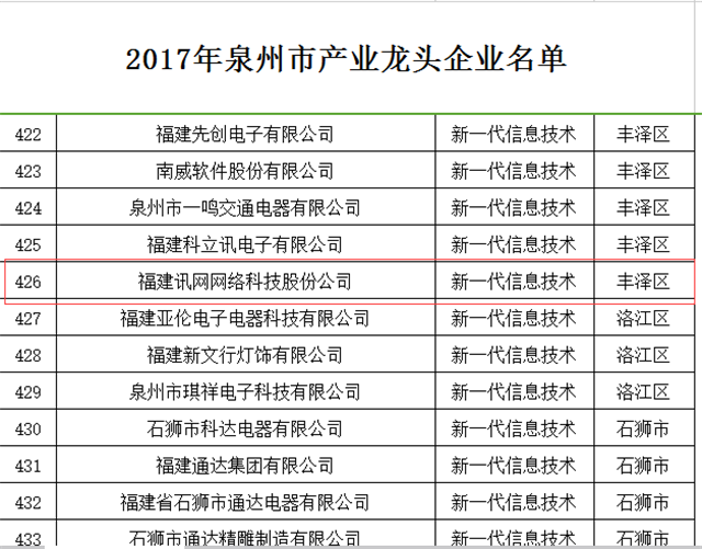 近日,經泉州市政府同意,泉州市建設制造業強市領導小組辦公室在泉州市經信委官網發布《2017年泉州市產業龍頭企業名單》,共有502家企業入選,訊網網絡榜上有名,成為29家“新一代信息技術”龍頭企業的一員。