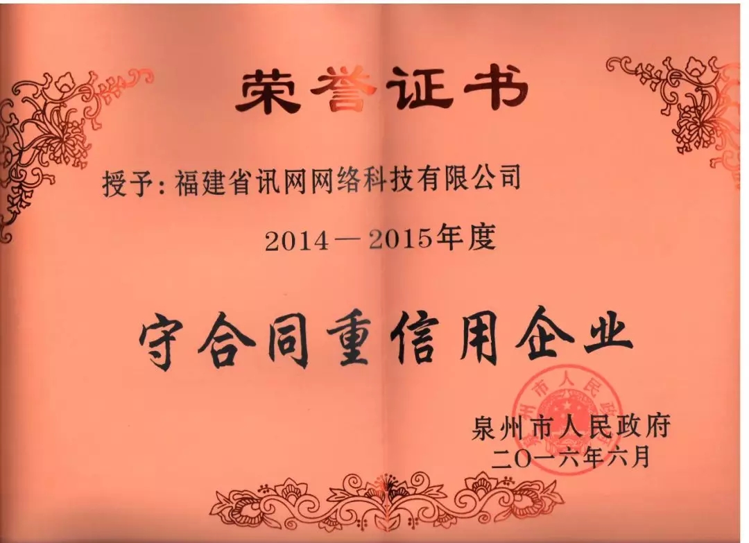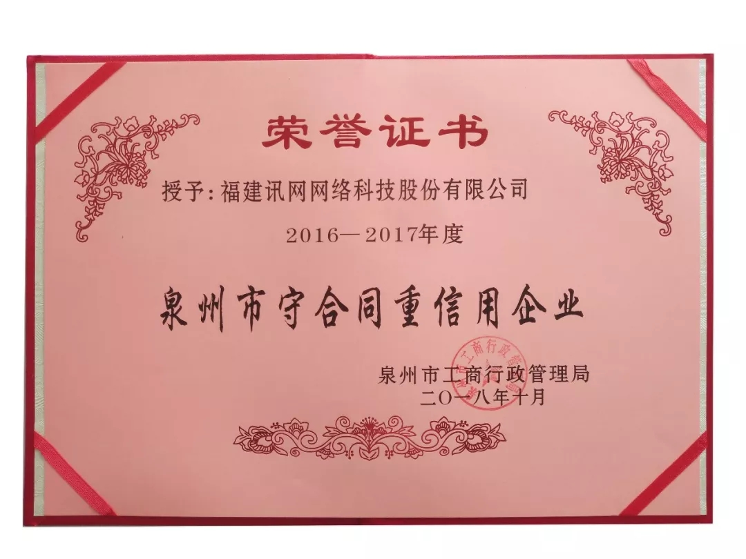 日前,2016-2017年度泉州市守合同重信用企業(yè)名單正式揭曉,福建訊網(wǎng)網(wǎng)絡(luò)科技股份有限公司(簡(jiǎn)稱“訊網(wǎng)網(wǎng)絡(luò)”)蟬聯(lián)泉州市守合同重信用企業(yè)。
