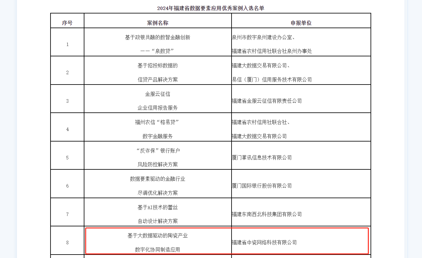 為深入貫徹《“數據要素×”三年行動計劃(2024—2026 年)》文件精神,充分發揮數據要素乘數效應,賦能經濟社會發展,日前,福建省數據管理局發布了2024年數據要素應用優秀案例,中瓷網絡“基于大數據驅動的陶瓷產業數字化協同制造應用”案例成功入選,泉州市唯一一家,祝賀!