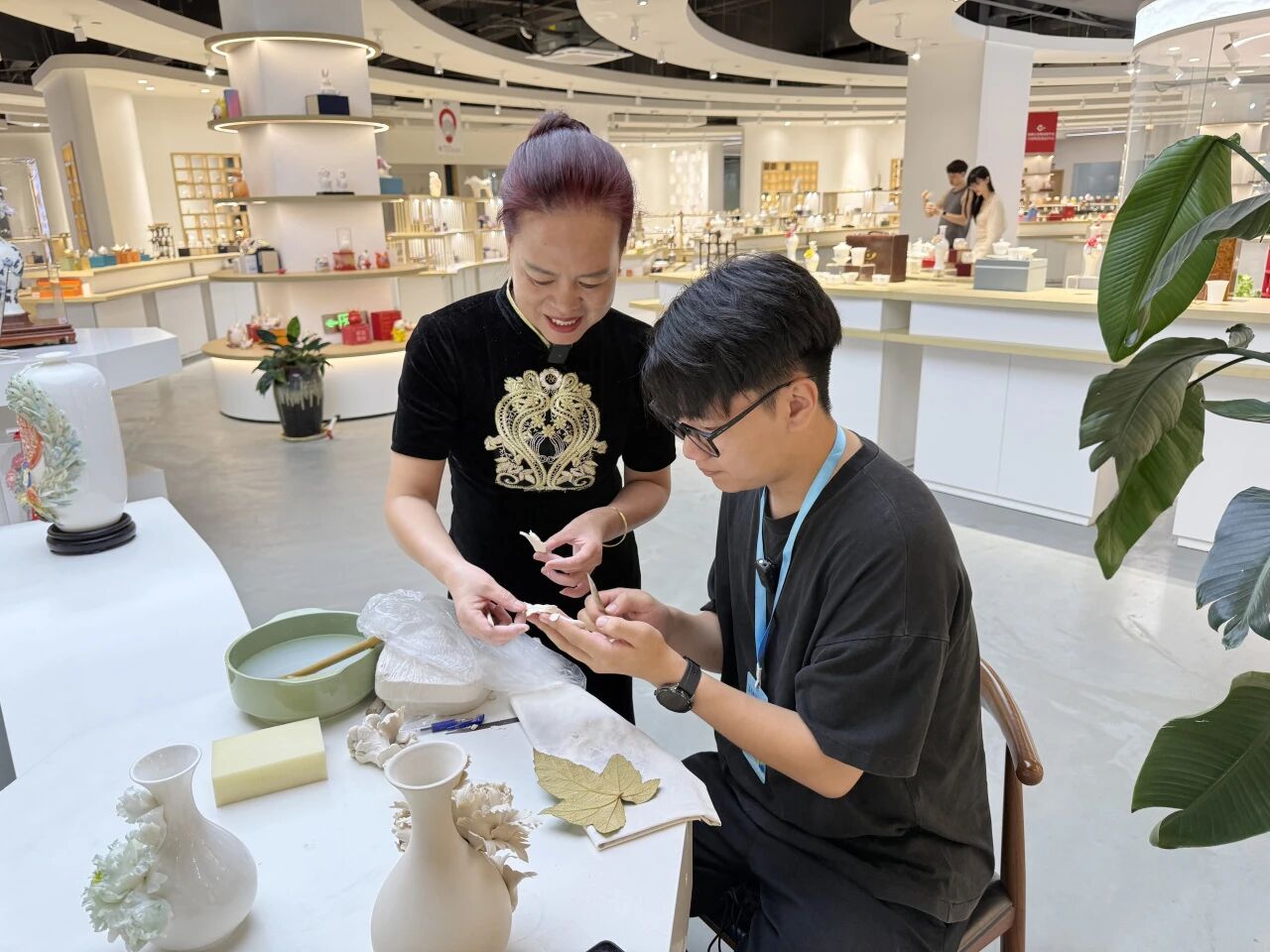 非遺手捏花傳承人查彩端現場演示德化瓷花創作過程,展現了精湛的傳統技藝。止余齋品牌主理人余麗萍老師以釉下青花手繪工藝,創作出兼具實用價值和藝術收藏價值的德化青花玉瓷作品。