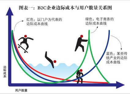 與門(mén)戶等互聯(lián)網(wǎng)產(chǎn)業(yè)一樣,B2C產(chǎn)業(yè)特征是典型的邊際成本先下降再上升,然后再下降的反微笑曲線(如下頁(yè)圖表所示)。無(wú)論是水漲船高的網(wǎng)絡(luò)推廣費(fèi)用,抑或是讓各家B2C企業(yè)坐如針氈、日益高昂的客戶獲取成本,B2C企業(yè)之爭(zhēng)已經(jīng)從原有的“野蠻式生長(zhǎng)”的陣地戰(zhàn),過(guò)渡到了今日的“搶人戰(zhàn)”。